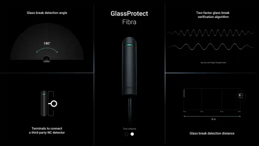 Drátový detektor rozbití skla, detekce na 9 metrů, dvoufázové ověření, nadčasový design.