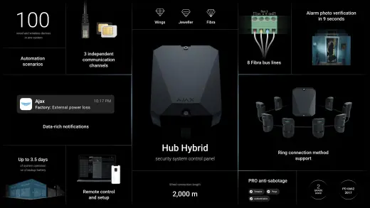 Hybridní ústředna zabezpečovacího systému Ajax, podpora foto verifikace, podpora 50 uživatelů, 100 komponentů, 2. stupeň zabezpečení.