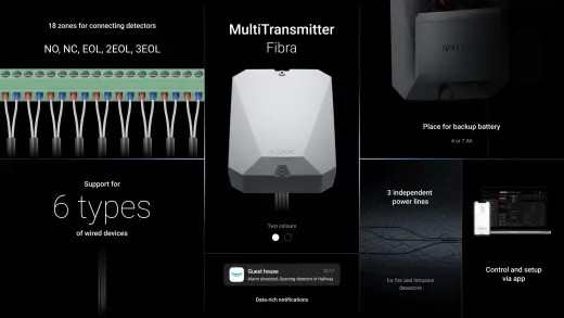 Drátový modul pro integraci drátových zařízení do systému Ajax, 18 vstupů, podpora 15 poplachových událostí, dosah mezi zařízením a detektory 400 metrů.