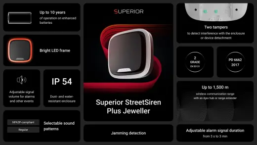 Superior StreetSiren Plus je moderní bezdrátová siréna pro bezpečnostní systém Ajax, která zajistí maximální viditelnost a slyšitelnost alarmu. Nabízí volitelné tóny, výraznou LED signalizaci a funkci Chime pro upozornění na vstup nebo odchod. Upozorňuje také na stav zabezpečení a na události po poplachu.