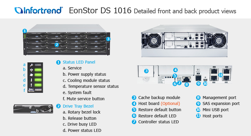 Profesionální diskové pole Infotrend EonStor DS 1000 druhé generace. Verze 3U pro 16 ks 3,5" disků, montáž do racku.