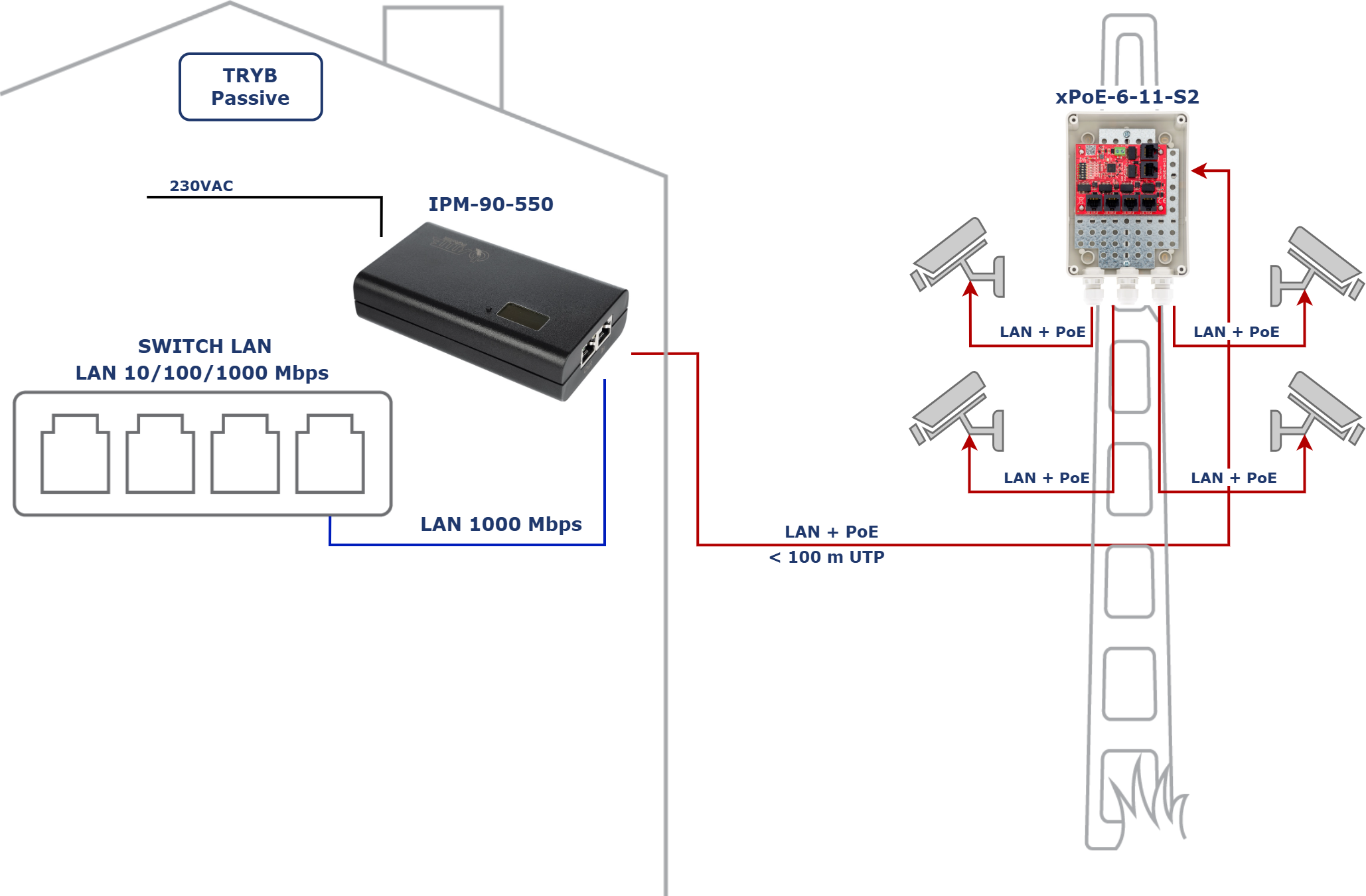 Příklad použití IPM-90-550 jako PoE Midspan pro přepínač xPoE-6-11-S2 v pasivním provozu PoE.