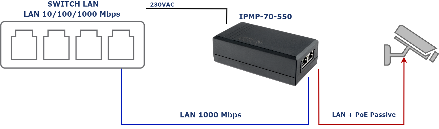 IPMP-70-550 se používá k napájení pasivních zařízení kompatibilních s PoE v sítích LAN. Umístěný mezi switch, který není vybaven napájením PoE (nebo nemá dostatečný rozpočet na napájení), a síťová zařízení (např. kamery, přístupové body, extendery) umožňuje současný přenos napájení a dat do IP zařízení PoE pomocí jediného kabelu UTP s rychlostí 10/100/1000 Mb/s.