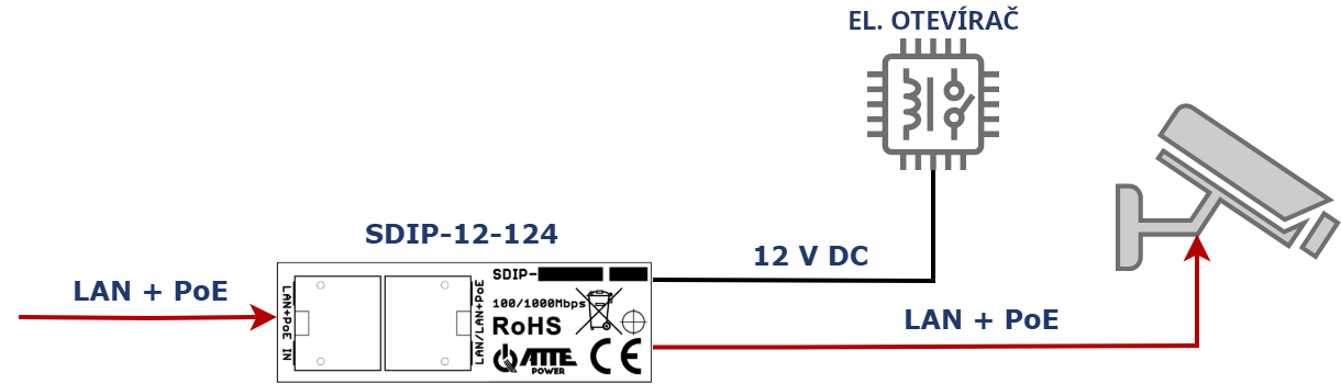 Příklad použití SDIP-12-124 k napájení dveřní stanice a elektrického otvírače dveří pomocí jediného kabelu UTP.