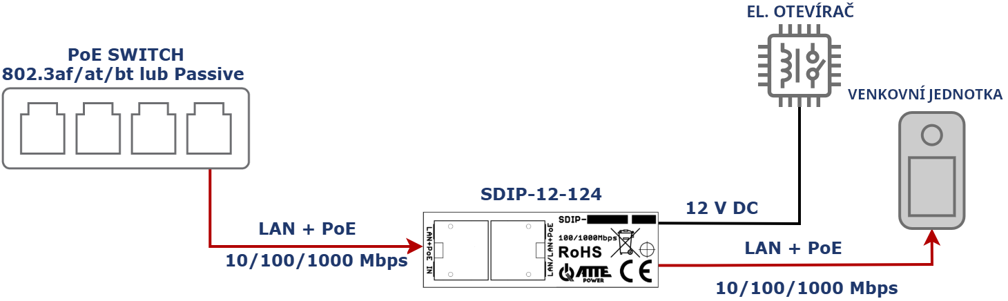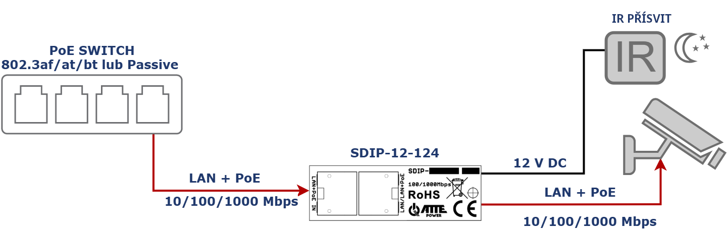 SDIP‑12‑124 je gigabitový PoE adaptér s měničem snižujícím napětí. Umožňuje napájet další zařízení s nominálním napětím 12 V přímo z PoE 802.3af pomocí jediného UTP kabelu.