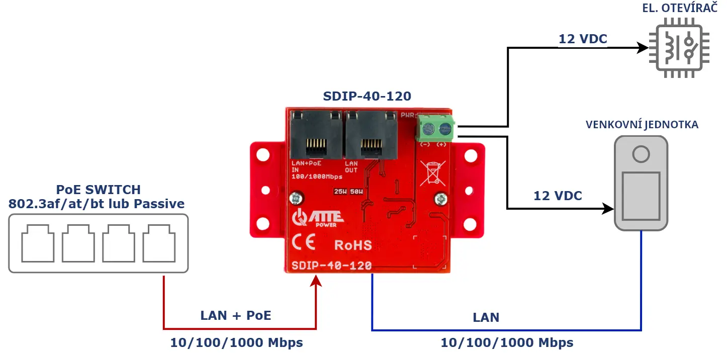 Příklad použití SDIP-40-120 pro napájení elektrického otvírače dveří a dveřní stanice na jednom kabelu UTP.
