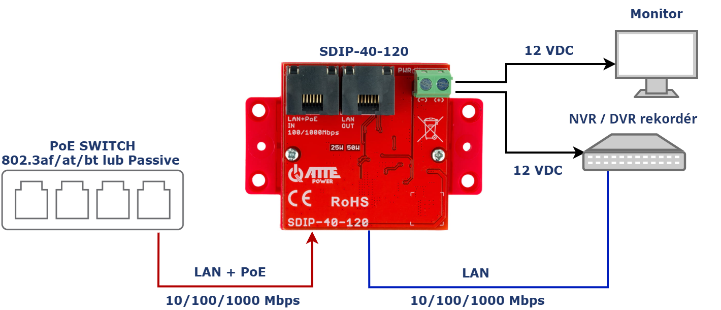 SDIP-40-120 je gigabitový adaptér PoE s měničem snižujícím napětí, výstup 12 VDC